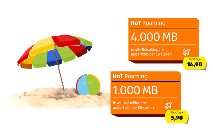 Mit unseren Roaming-Paketen können Sie ab sofort Datenvolumen für beliebte Reiseziele außerhalb der EU buchen! HoT Roaming-Pakete sind 30 Tage gültig – falls Sie mehr Daten benötigen, buchen Sie einfach nach Belieben weitere Pakete dazu. Die 30-tägige Gültigkeit startet mit jeder weiteren Buchung neu. Beide Roaming-Pakete sind mit allen HoT Handytarifen (ausgenommen HoT smart mini und HoT smart Control) kompatibel.